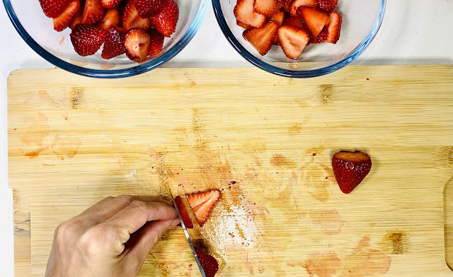 11) Remove bowl from the refrigerator (see step 1) and pour in cold whipping cream, sugar and vanilla essence. Slice 4-5 strawberries vertically, depending on their size, into thin slices and reserve in a bowl.